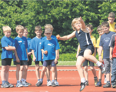 Vielköpfige Eichsfelder Riege: Aufmerksam beobachten die jüngsten Leichtathletik-Jungen der LG Eichsfeld die Konkurrenz beim Schlagballweitwurf im Probedurchgang. Straubel (3) |